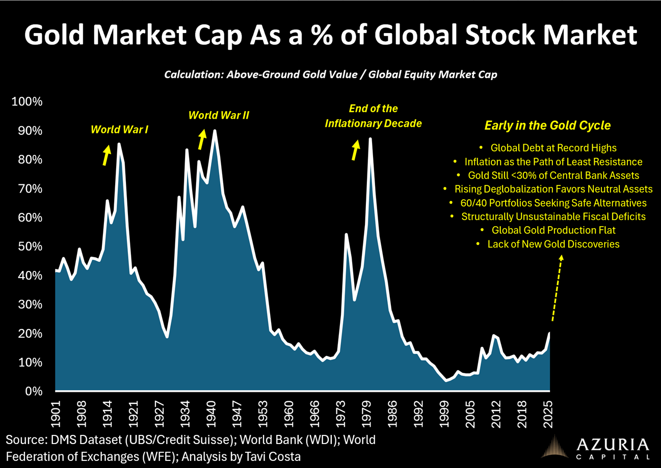 At the core of the mining industry lies the cycle in metal prices. And at the center of that cycle stands gold. Gold sets the tone. Understanding its behavior is essential to understanding what will ultimately unfold across the broader metals complex. We are experiencing the beginning of one of the largest rotations out of financial assets and into hard assets in modern history, in our view. Comparing the size of the gold market to global equities cuts through narrative and underscores how early this rebalancing remains relative to financial assets.