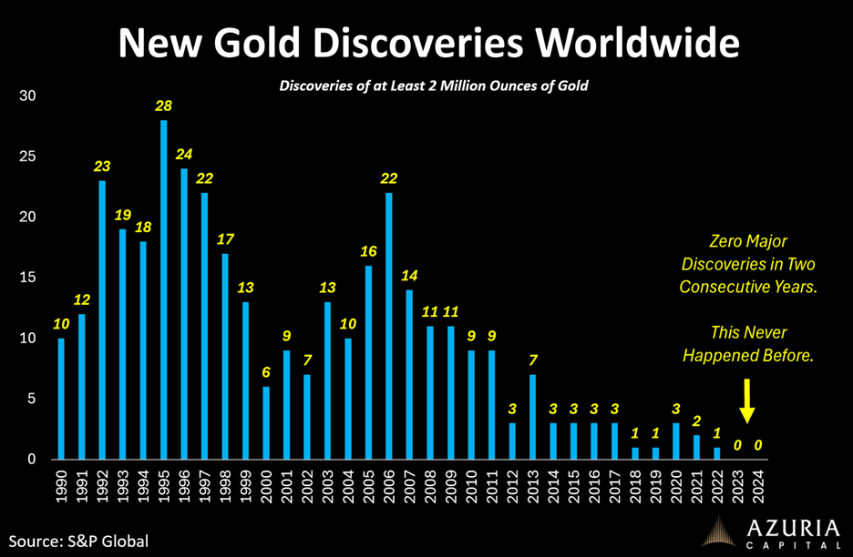 The new supply conundrum is a clear example. For the first time in recorded history, global data show zero gold discoveries in two consecutive years. This has never occurred before. And this is not unique to gold.